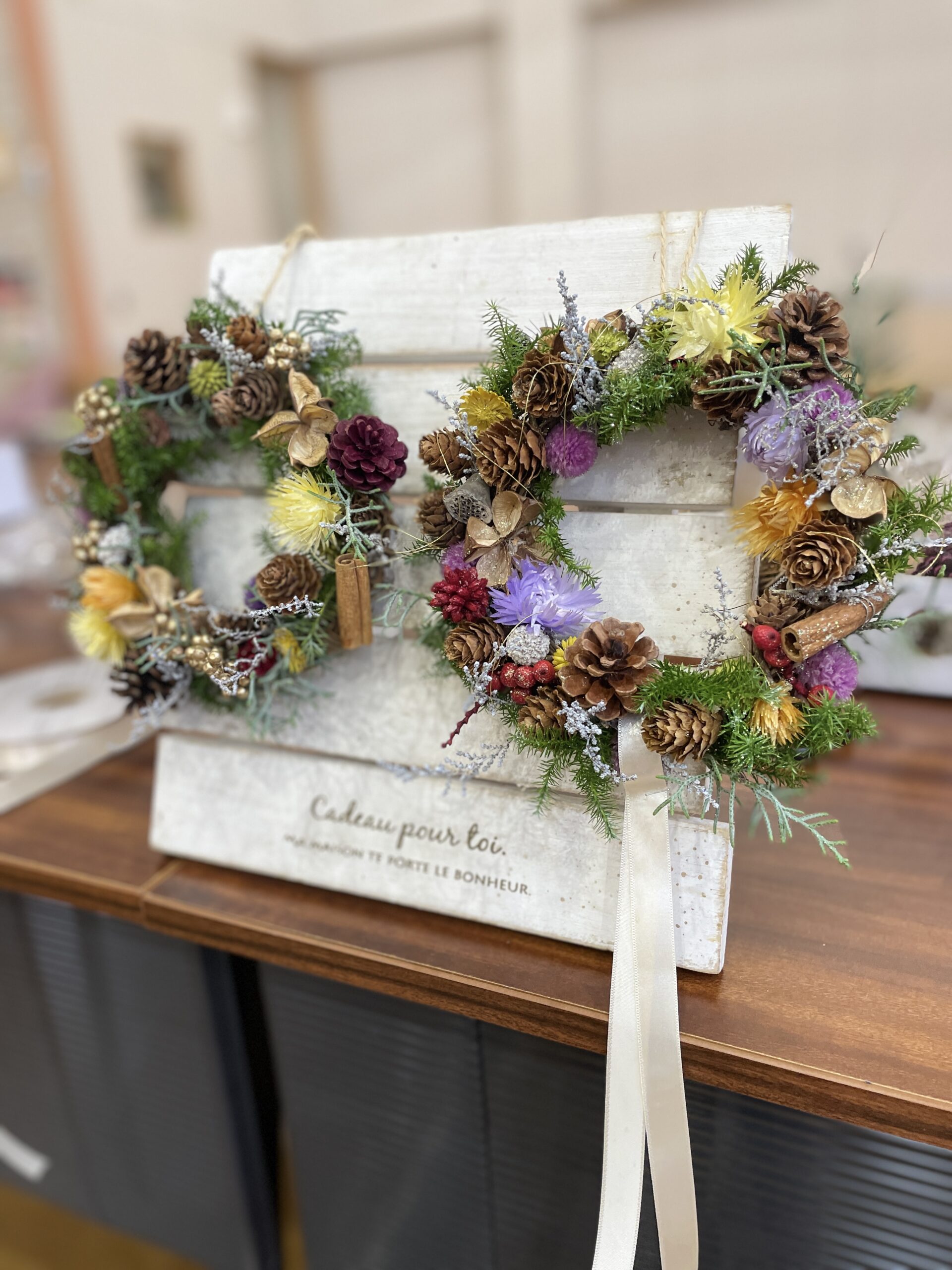 今回は、ドライの花材を使い長く楽しめるリースとしました*